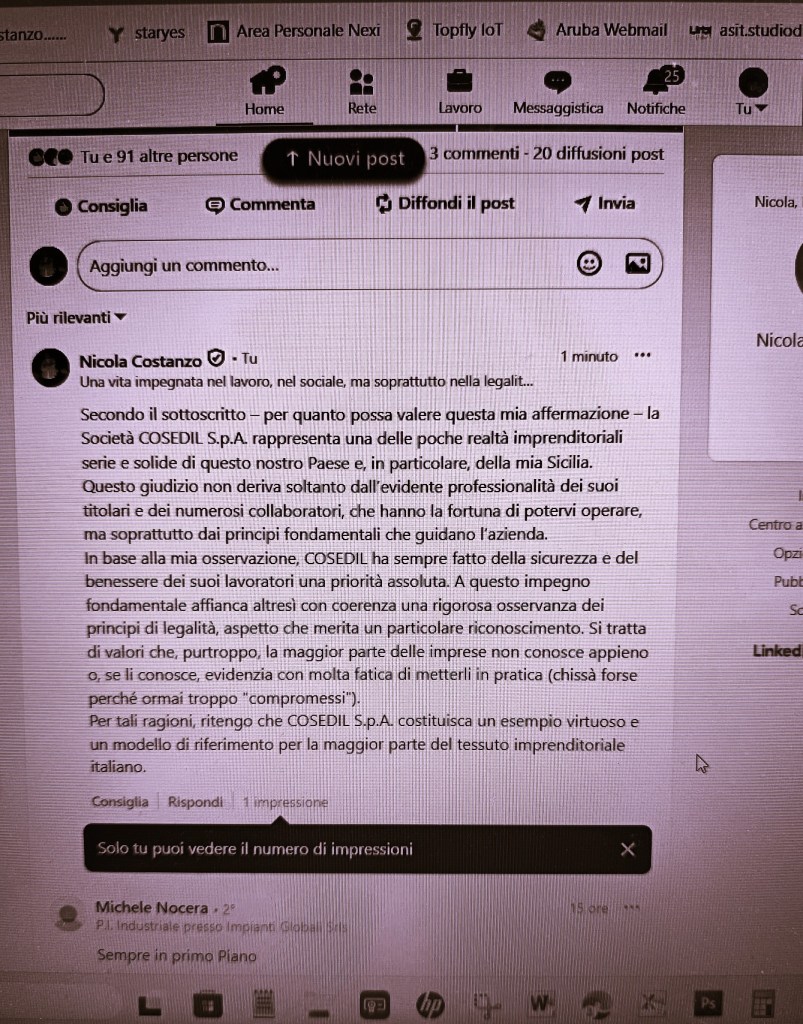 Condivido, senza riserve, le parole dell’Ing. Gaetano Vecchio, uno dei titolari dell’azienda – e lo dico con la massima trasparenza, visto che qualcuno potrebbe insinuare retroscena personali: non conosco l’ingegnere né di vista, né in cantiere, neppure per lontana fama professionale. In 35 anni di direzione tecnica, trascorsi quasi interamente fuori dalla Sicilia – per scelta, per lavoro, per necessità – non ci siamo mai incrociati. Solo da un anno e mezzo sono tornato qui, in questa terra che amo con tutte le sue contraddizioni, eppure sempre – come dimostrano con i fatti le mie denunce – con gli occhi aperti.