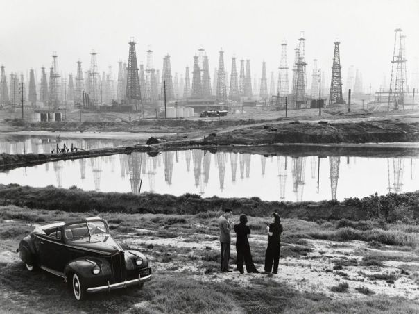 A forest of oil derricks makes a ghostly backdrop for a conversation in Signal Hill, California, in 1941.