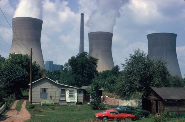 Water cooling towers of the John Amos Power Plant loom over a Poca, WV, home that is on the other side of the Kanawha River. Two of the towers emit great clouds of steam. Poca, West Virginia, August 1973.