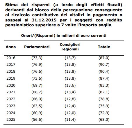 Quanto ai consiglieri regionali, “i soggetti interessati a fine 2015 sarebbero 1.650 con un differenziale complessivo tra vitalizio lordo 2015 e ricalcolo contributivo di circa 35,2 milioni di euro”, con una perdita media di oltre 21.300 euro.