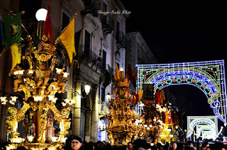 La città inoltre si riempie di colori, spettacoli, musica e luci… di grande effetto quelle fiaccole accese, espresse dai “cerei” donati alla Santa…