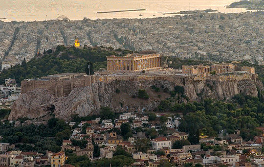 Timelapse dell’accensione delle luci del Partenone e dell’Acropoli al crepuscolo