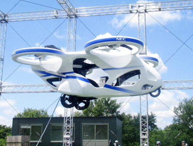 Ieri 5 Agosto, la Japan Electric Corporation (NEC) ha pilotato ls prima macchina volante, anche se assomiglia a un drone in quanto dotata di quattro eliche, e nel librarsi agevolmente in aria, riesce a volare ad un’altezza di 3 metri.
