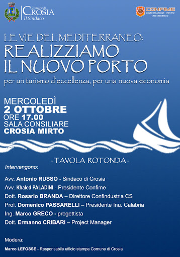 “Le vie del Mediterraneo”, è il titolo della tavola rotonda organizzata dall’Amministrazione comunale di Crosia in collaborazione con la Confederazione delle Imprese del Mediterraneo (CONFIME) che si terrà il prossimo mercoledì 2 Ottobre 2019 alle ore 17.00 nella nuova Sala del Consiglio comunale di viale della Repubblica a Mirto.