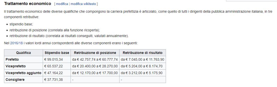 Ed allora mi permetto di allegare un prospetto che descrive il trattamento economico delle diverse qualifiche che compongono le figure prefettizia, i cui valori lordi annui però, sono leggermente inferiori a quelli attuali, in quanto fanno riferimento al periodo 2016/18…