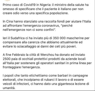 Ormai ogni giorno vi è una notizia, ma ciò che maggiormente preoccupa è vedere come questo nostro Paese manchi totalmente di solidarietà, se non quella compiuta per pubblicità gratuita o per propaganda personale, poi appena le telecamere sono sparite si continua con la pausa nei riguarda degli extracomunitari in particolare dei cinesi, si continua con il terrore degli stranieri, ma non solo, anche dei nostri stessi connazionale, siano essi “polentoni e/o terroni”, e mentre da noi la psicosi vince sull’ignoranza, altri paesi ci dimostrano la propria solidarietà…