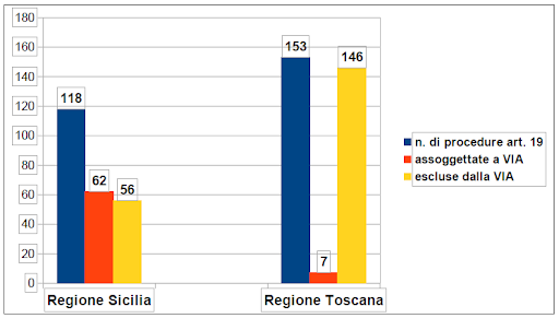 Infatti, dai dati estrapolati dai decreti assessoriali e dirigenziali della Regione Sicilia e della Regione Toscana, pubblicati nei rispettivi siti internet regionali, emerge che nel periodo agosto 2019, periodo aprile 2021 – l’autorità ambientale siciliana ha decretato n. 118 istanze contro le 153 della Regione Toscana (al netto delle pratiche archiviate) e che per la Regione Sicilia ben 62 istanze sono state assoggettate a VIA, mentre in Toscana solo 7 istanze sono state assoggettate a VIA.