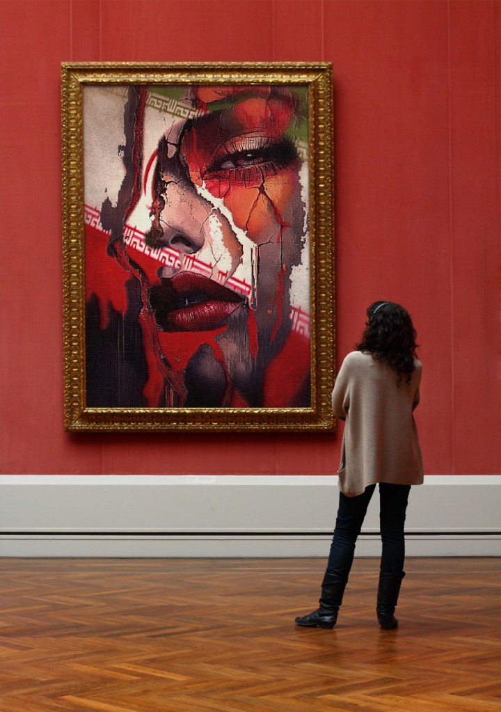 Guardo questo quadro e vedo una donna iraniana che soffre. Un’opera astratta, certo, i contorni sfumati, i colori forse confusi, ma il dolore che emana è fin troppo concreto, tagliente, reale.