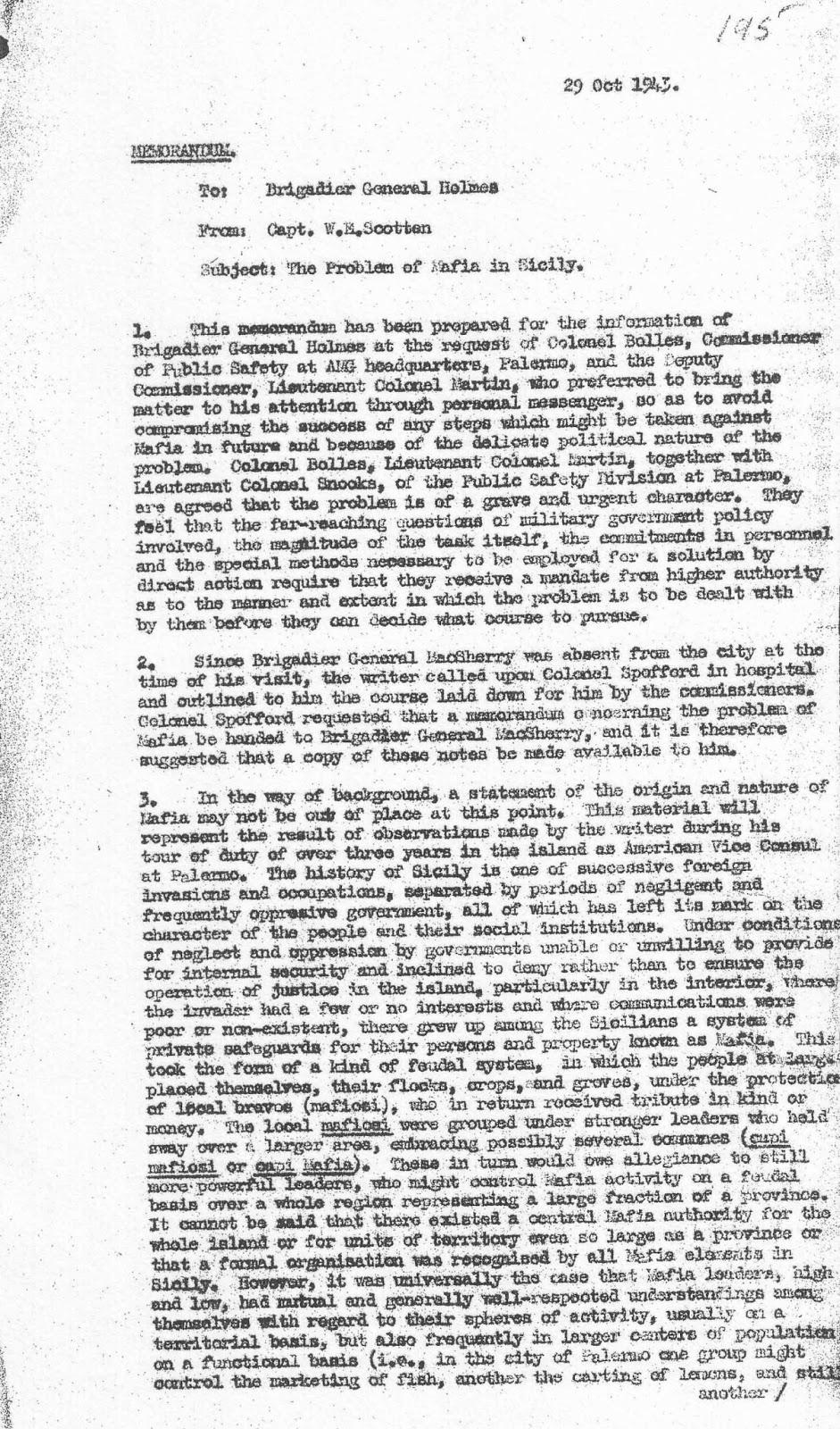 Scriveva il Cap. Scotten: “I contatti da me sostenuti con la popolazione siciliana concordano pienamente sul fatto che la mafia è rinata. Il terrore della mafia sta rapidamente tornando e secondo i miei informatori, la mafia si sta ora dotando di armi ed equipaggiamenti moderni, il problema si moltiplicherà creando difficoltà alla Polizia… La popolazione siciliana non crede che i carabinieri o gli altri corpi di polizia siano in grado di affrontare la mafia. Li ritiene corrotti, deboli e in molti casi, in combutta con la stessa mafia. Carabinieri e polizia ricevono individualmente una parte dei guadagni dei vari racket, ma anche intere porzioni di questi introiti. Molti siciliani si lamentano del fatto, ed è la cosa più inquietante, che molti nostri interpreti di origine siciliana provengano direttamente da ambienti mafiosi statunitensi. La popolazione afferma che i nostri funzionari sono ingannati da interpreti e consiglieri corrotti, al punto che vi è il pericolo che diventino uno strumento inconsapevole in mano alla mafia… Agli occhi dei siciliani, non solo il Governo Militare Alleato non è in grado di affrontare la mafia, ma è arrivato addirittura al punto da essere manipolato. Ecco perché al giorno d’oggi molti siciliani mettono a raffronto il Governo Militare Alleato e il Fascismo… Sotto il Fascismo la mafia non era stata interamente debellata, ma veniva almeno tenuta sotto controllo. Oggi invece cresce con una velocità allarmante e ha raggiunto addirittura una posizione di rilievo nel Governo militare alleato».