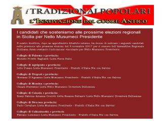 Va ricordato inoltre che proprio il candidato del Centrodestra Nello Musumeci ha firmato alcuni giorni or sono, il documento politico programmatico de “I Tradizional Popolari” (movimento di opinione nato nel 2010 e presente in tutte le provincie dell’isola, che sarà al suo fianco nella corsa verso la Presidenza della Regione Siciliana).