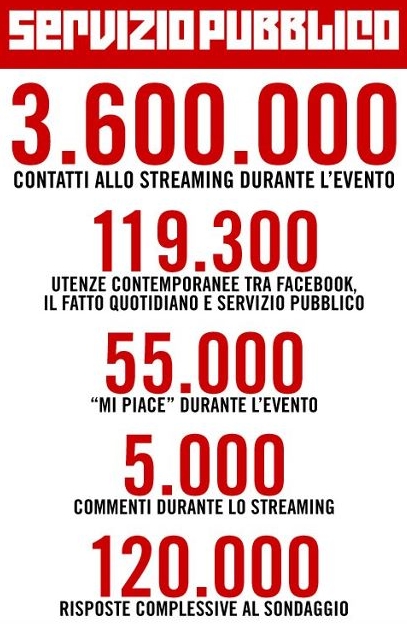 Servizio Pubblico dimostra che a differenza di quanto avrebbe dovuto fare il pubblico servizio, in maniera gratuita su RAI2, poteva continuare ad essere trasmessa una trasmissione che tutti volevano e che invece è stata soppressa da un dirigente ( che viste le intercettazioni telefoniche, presenti su Youtube), che obbediva al nostro ex Presidente del Consiglio…, che, oscurando la trasmissione Pubblica in piena audience, privilegiava invece quella propria e della propria famiglia…