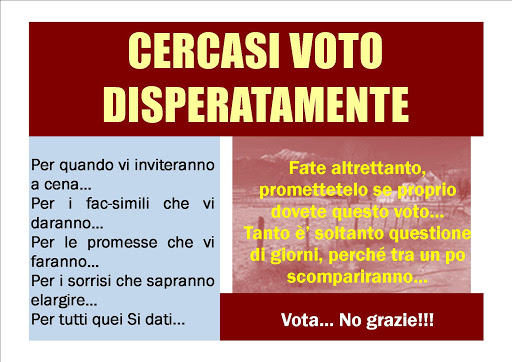 Oggi tentate ancora di illuderci (ovviamente qui mi riferisco a tutti i politici… ), con quel’esca morta e già utilizzata, sperate di far cadere qualcuno nei vostri tranelli, ma la cosa assurda è che sapete anche di poterci riuscire…, ma questo è un altro problema, strettamente e vergognosamente tutto Italiano…