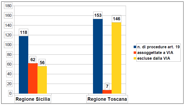 Infatti, dai dati estrapolati dai decreti assessoriali e dirigenziali della Regione Sicilia e della Regione Toscana, pubblicati nei rispettivi siti internet regionali, emerge che nel periodo agosto 2019, periodo aprile 2021 – l’autorità ambientale siciliana ha decretato n. 118 istanze contro le 153 della Regione Toscana (al netto delle pratiche archiviate) e che per la Regione Sicilia ben 62 istanze sono state assoggettate a VIA, mentre in Toscana solo 7 istanze sono state assoggettate a VIA.