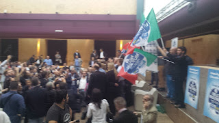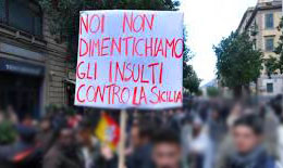 Tra sorrisi e strette di mano, c’è anche chi manifesta il proprio dissenso con striscioni “La Sicilia è dei siciliani, itivinni in Padania“…
