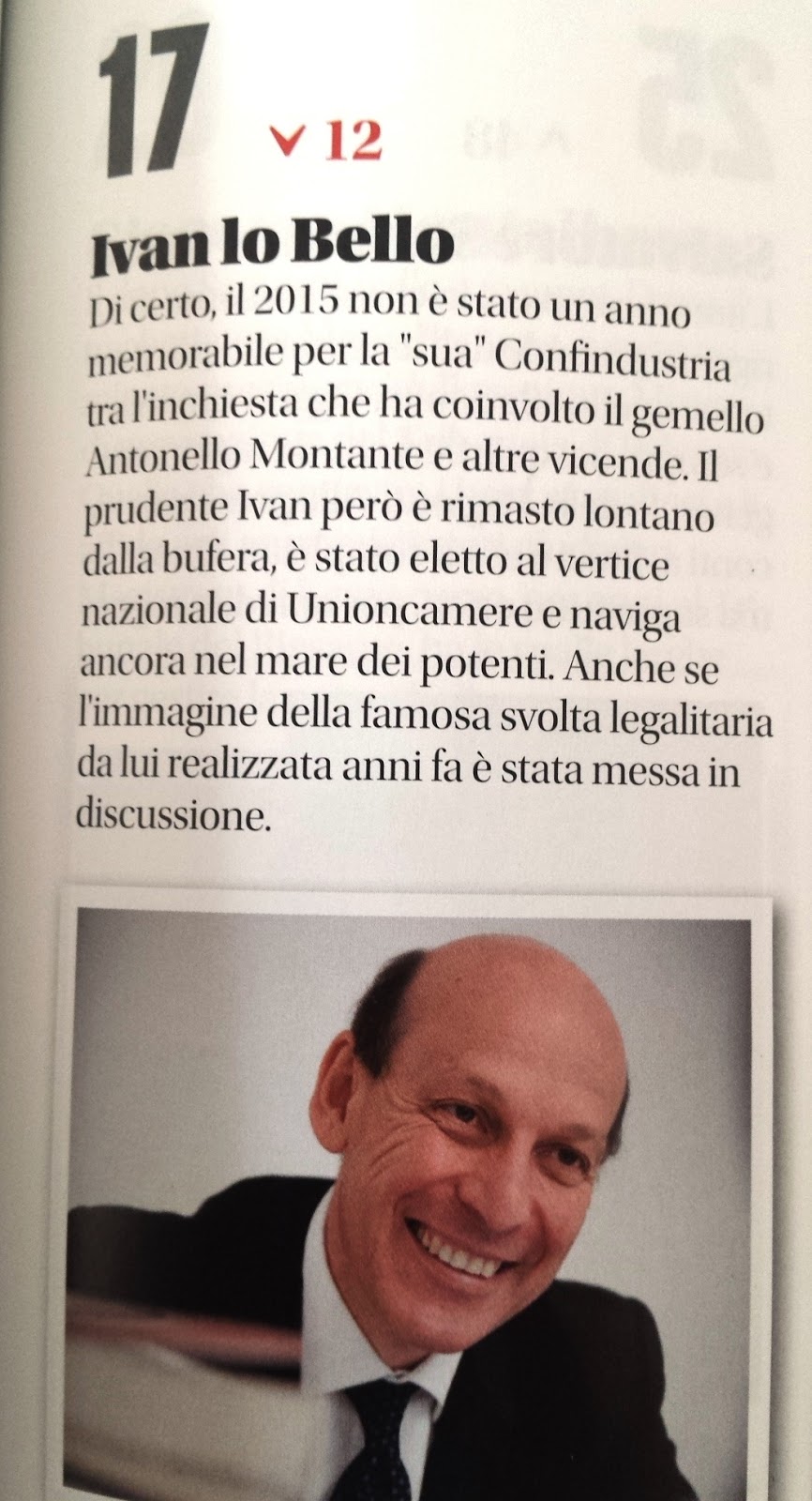 L’Anno scorso il mensile lo poneva 17′ con questa dicitura: “di certo, il 2015 non è stato un anno memorabile per la “sua” confindustria tra l’inchiesta che ha coinvolto il gemello Antonello Montante e altre vicende; Il prudente Ivan però è rimasto lontano dalla bufera, è stato eletto al vertice nazionale di Unioncamere e “naviga” ancora nel mare dei potenti. Anche se l’immagine della famosa svolta legalitaria da lui realizzata anni fa è stata messa in discussione”.