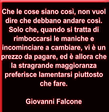 Ecco perché rivolgendomi a quegli altri individui coraggiosi, se pur ahimè sempre più esigui, ricordo loro che vige la regola che: non si può sconfiggere chi non si arrende mai!!! Viceversa per tutti gli altri avvezzi ormai all’omertà e al sostegno della criminalità, beh… ecco che essi a differenza nostra possono arrendersi: sì… peraltro per come fanno abitualmente, utilizzando la complicità, la collusione, la concussione e soprattutto la corruzione!!!