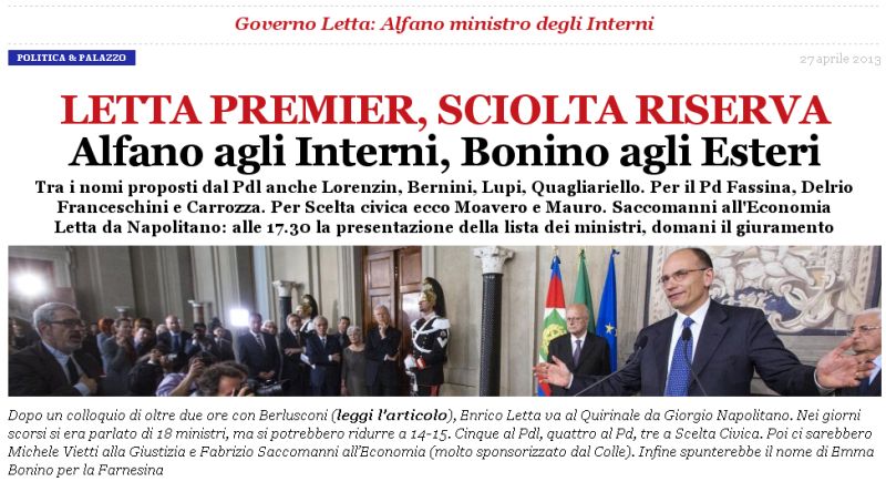 Ed allora ecco i nomi “nuovi” della squadra di governo: Alfano, D’Alema, Monti, Mauro,Cancellieri, Amato, Padoan, Brunetta, Franceschini, Gelmini, Chiamparino, Violante, Delrio, Fassina, Saccomanno, Giovannini, Bonino, Lupi , Bubbico, Quagliariello, ovviamente senza dimenticare lo zio… Gianni Letta!!!