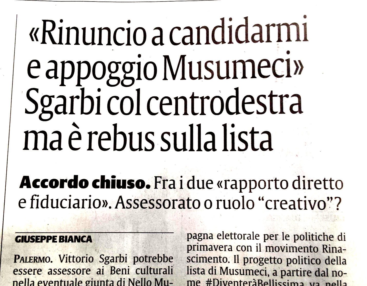 Dando seguito alla lettera aperta (da “Siciliano Libero”) inviata a mezzo email al Prof. Vittorio Sgarbi e pubblicata in questo mio Blog alcuni giorni fa, sono veramente felice di avere appreso stamani, dal quotidiano La Sicilia, della sua rinuncia alla candidature di presidente della nostra regione…Nell’articolo si evidenzia inoltre la possibilità che Egli possa diventare assessore ai Beni culturali, sempre nell’eventualità che… diventi presidente Nello Musumeci.