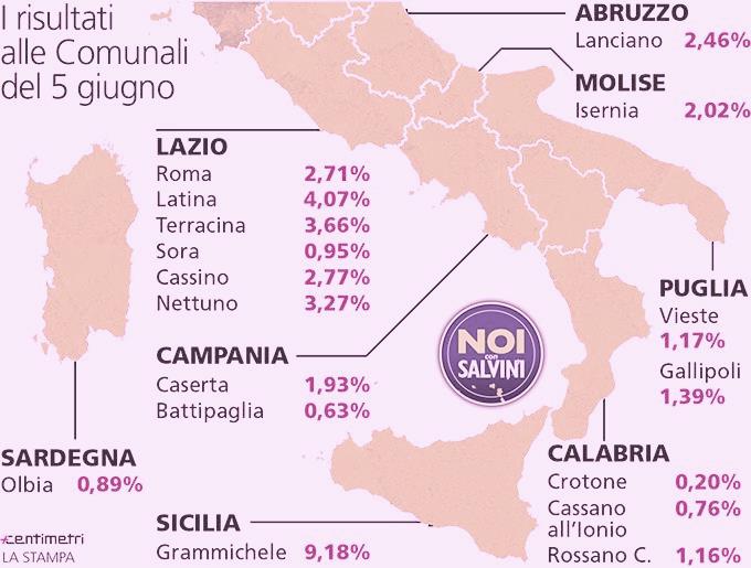 Ricordo per esempio… Agrigento, dove il deputato Marcolin si era piazzato terzo con il 9,22% (mentre la lista ‘Noi con Salvini’ si era fermata soltanto al 3,56%); oppure a Milazzo, dove Giuseppe Ragusi si era fermato al’l,53% delle preferenze (con 1,26% la lista); analoga situazione si era ripetuta a Gela, dove Antonio Giudice, non era riuscito ad andare oltre l’1,05%; mentre un po’ meglio era andata a Lorenzo Seminerio a San Giovanni La Punta, che, con il suo 11,77% si era classificato terzo (la lista comunque s’era fermata al 5,20% ); tra le delusioni vi era Marsala, dove Vito Armato era risultato ultimo con l’1,37%, ed eguale risultato, aveva ottenuto Paolo Corrao a Villabate, con il suo 9,38%, (la lista… soltanto il 5,90% ). Oggi in tutti i comuni siciliani in cui si è votato, Alcamo, Antillo, Barrafranca, Calascibetta, Caltagirone, Canicattì, Capo d’Orlando, Caronia, Falcone, Favara, Ferla, Ficarra, Galati Mamertino, Giarre, Grammichele, Lentini, Montevago, Noto, Patti, Porto Empedocle, Ramacca, Rodì Milici, San Marco d’Alunzio, Sant’Angelo di Brolo, Sortino, Terrasini, Torregrotta, Vallelunga Pratameno, Vittoria, la costola della Lega Nord “Noi con Salvini”… ha raccolto soltanto briciole…