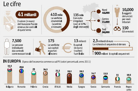 Invece di cercare di farsi pagare quelle multe del caz… o quella ridicola tassa sull’auto, perché non si realizza una patrimoniale giusta, perché non si parla mai di tutti gli quegli studi medici/legali/tecnici che giornalmente incassano a nero, migliaia e migliaia di euro…e  che rappresentano da soli i miliardi di euro mancanti dalle nostre casse…