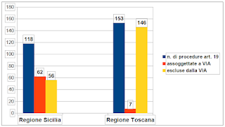 Infatti, dai dati estrapolati dai decreti assessoriali e dirigenziali della Regione Sicilia e della Regione Toscana, pubblicati nei rispettivi siti internet regionali, emerge che nel periodo agosto 2019, periodo aprile 2021 – l’autorità ambientale siciliana ha decretato n. 118 istanze contro le 153 della Regione Toscana (al netto delle pratiche archiviate) e che per la Regione Sicilia ben 62 istanze sono state assoggettate a VIA, mentre in Toscana solo 7 istanze sono state assoggettate a VIA.