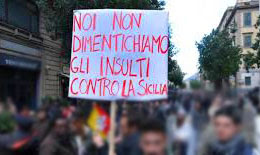 Tra sorrisi e strette di mano, c’è anche chi manifesta il proprio dissenso con striscioni “La Sicilia è dei siciliani, itivinni in Padania“…