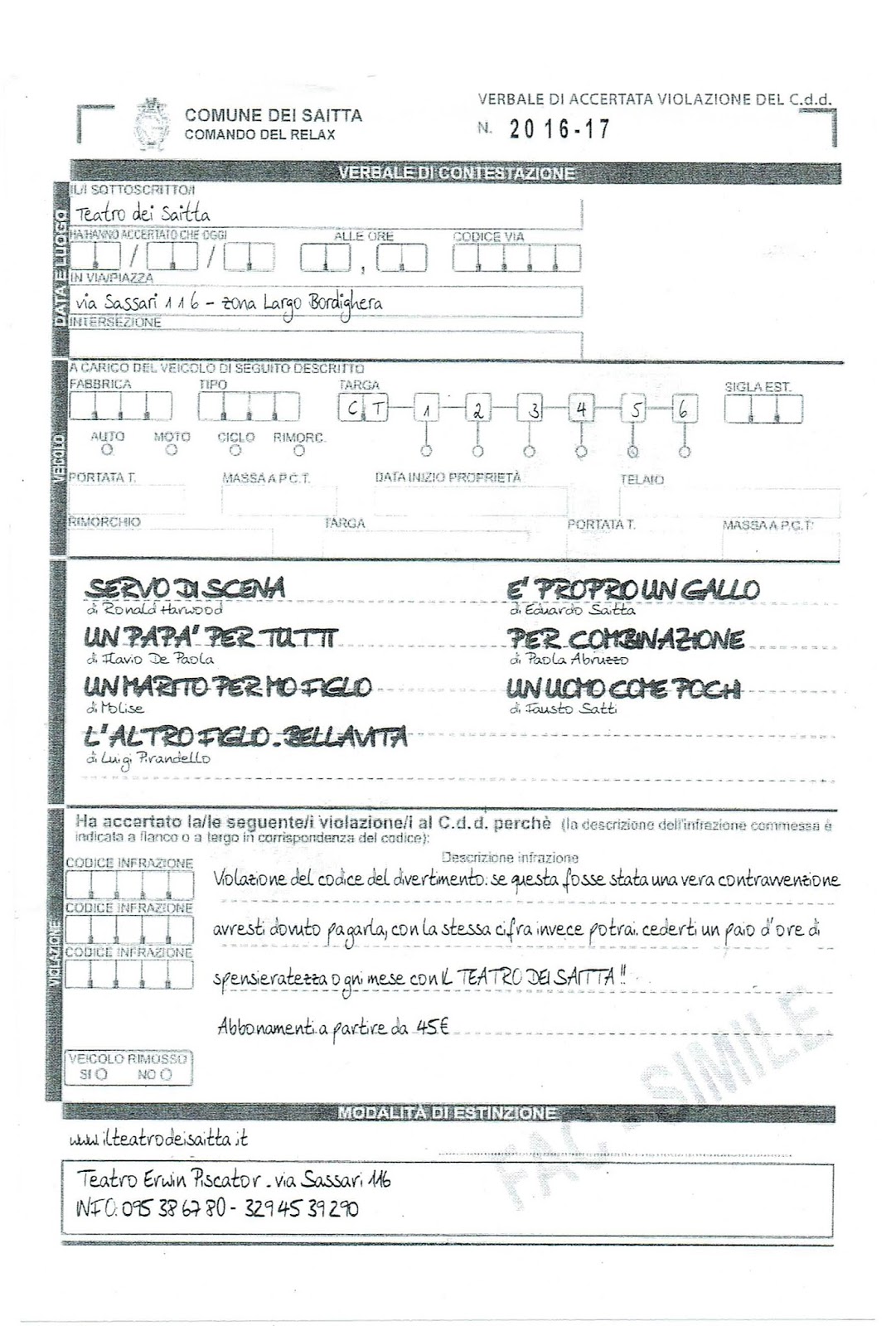 C’è scritto: violazione del codice del divertimento; se questa fosse stata una vera contravvenzione avresti dovuto pagarla… con la stessa cifra  invece, potrai cederti un paio d’ore di spensieratezza ogni mese con il “Teatro dei Saitta”…