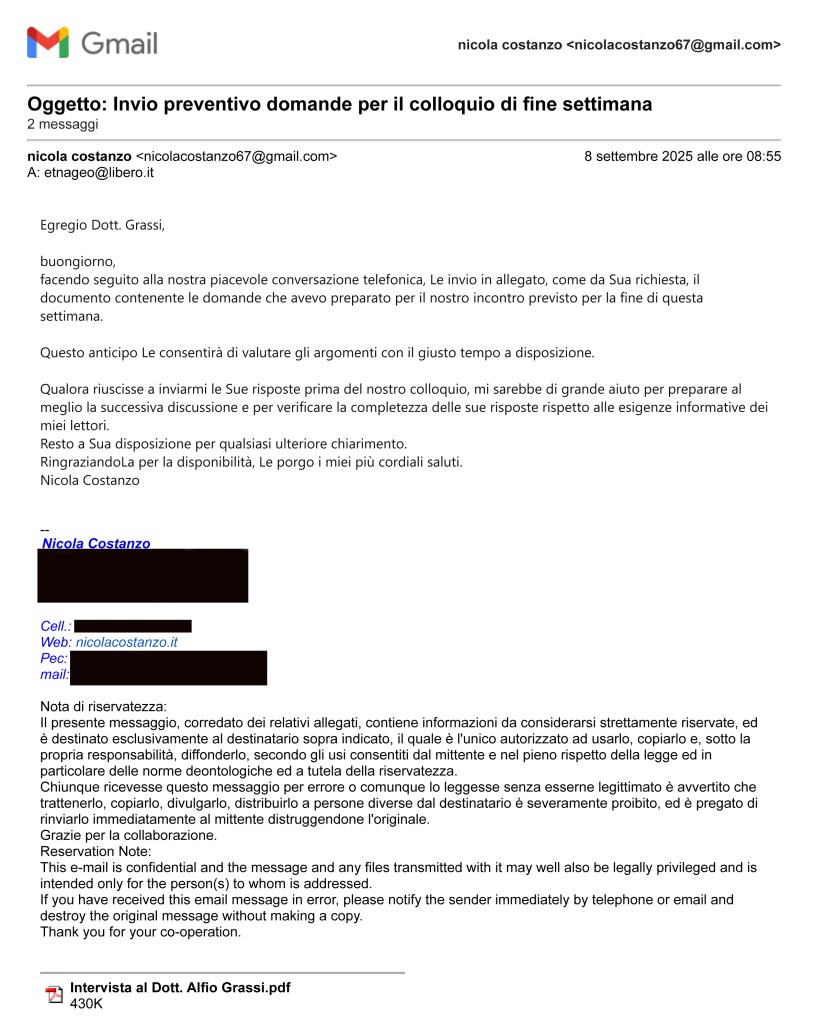 Come promesso ai miei lettori più attenti, oggi ho avuto il privilegio di incontrare il Dott. Alfio Grassi nel suo ufficio, un professionista che desidero ringraziare pubblicamente non solo per la disponibilità dimostrata, ma per il coraggio e l’integrità intellettuale con cui ha deciso di affrontare una tematica spinosa, proprio come aveva preannunciato nella sua breve risposta – vedasi link: http://nicola-costanzo.blogspot.com/2025/09/richiesta-intervista-al-dott-alfio.html. Dietro la mia insistente richiesta di un confronto, c’era una semplice ma fondamentale ricerca: trovare delle risposte.