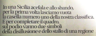 Mi riferisco proprio a quel 61 a zero… a quando cioè la Sicilia era nelle mani del centro-destra e cosa fece per essa… nulla, l’ha completamente abbandonata a se stessa o meglio, l’ha lasciata nelle mani di quei politici corrotti e dei loro amici mafiosi…Perché in fin dei conti di questo si è trattato: di un vero e proprio scambio di favori, tra chi raccoglieva voti e chi si aggiudicava gli appalti!!!