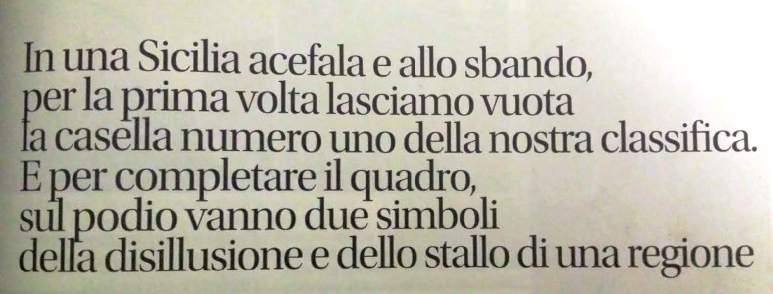 Mi riferisco proprio a quel 61 a zero… a quando cioè la Sicilia era nelle mani del centro-destra e cosa fece per essa… nulla, l’ha completamente abbandonata a se stessa o meglio, l’ha lasciata nelle mani di quei politici corrotti e dei loro amici mafiosi…Perché in fin dei conti di questo si è trattato: di un vero e proprio scambio di favori, tra chi raccoglieva voti e chi si aggiudicava gli appalti!!!